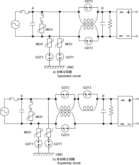 電源にサージが侵入し、図のような電源線とグラウンド間のサージ対策回路 (A点) が機能した場合、その残留電圧が後段に伝わります。残留電圧は、ノイズフィルタやコイルのLC共振により、増幅されて後段の回路を破壊する場合があります。対策として、コモンモードコイルの前後及びコイルの両端をサージアブソーバ (GDT2、GDT3)で等電位化する方法が推奨されます。