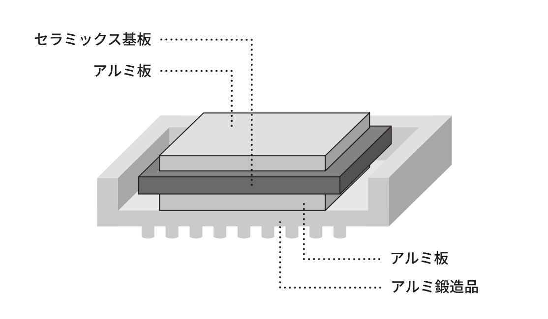 回路層に搭載した素子等において発生した熱を効率的に放散させるために、絶縁層の他方の面側にヒートシンクを接合する構造が取られていますが、当社では絶縁基板とヒートシンクを接合させるノウハウを有しており、様々な部材の組み合わせにあった仕様をご提案することができます。