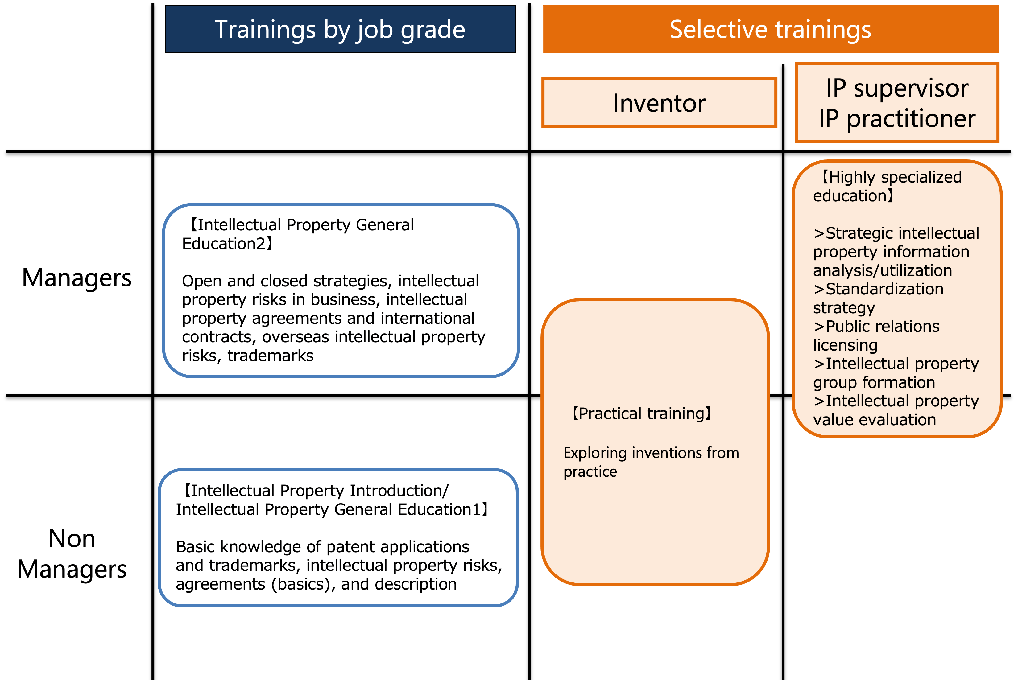 We provide training for Group employees to improve their intellectual property literacy, utilize intellectual property information in business activities, and form effective intellectual property. In addition to Trainings by job grade for the purpose of acquiring knowledge about general intellectual property, practical trainings aiming for specialized and strategic utilization of intellectual property is provided as selective education.
