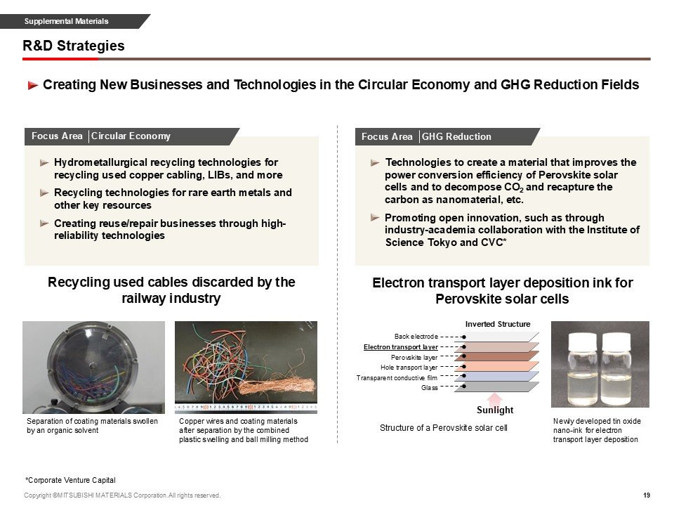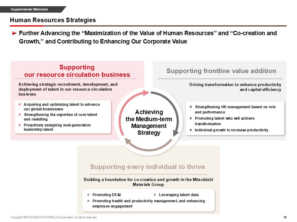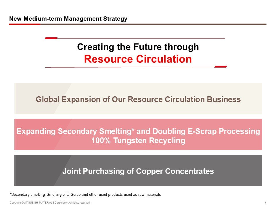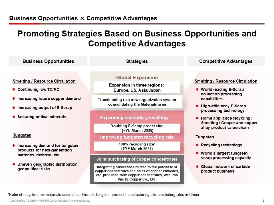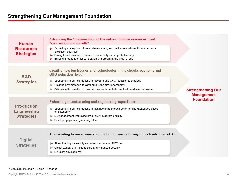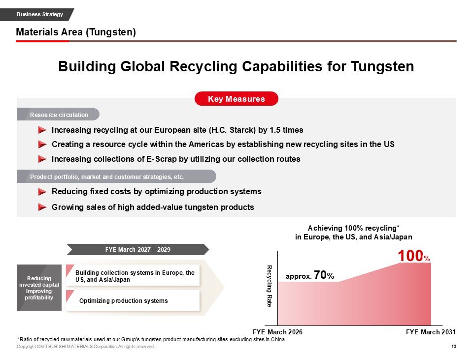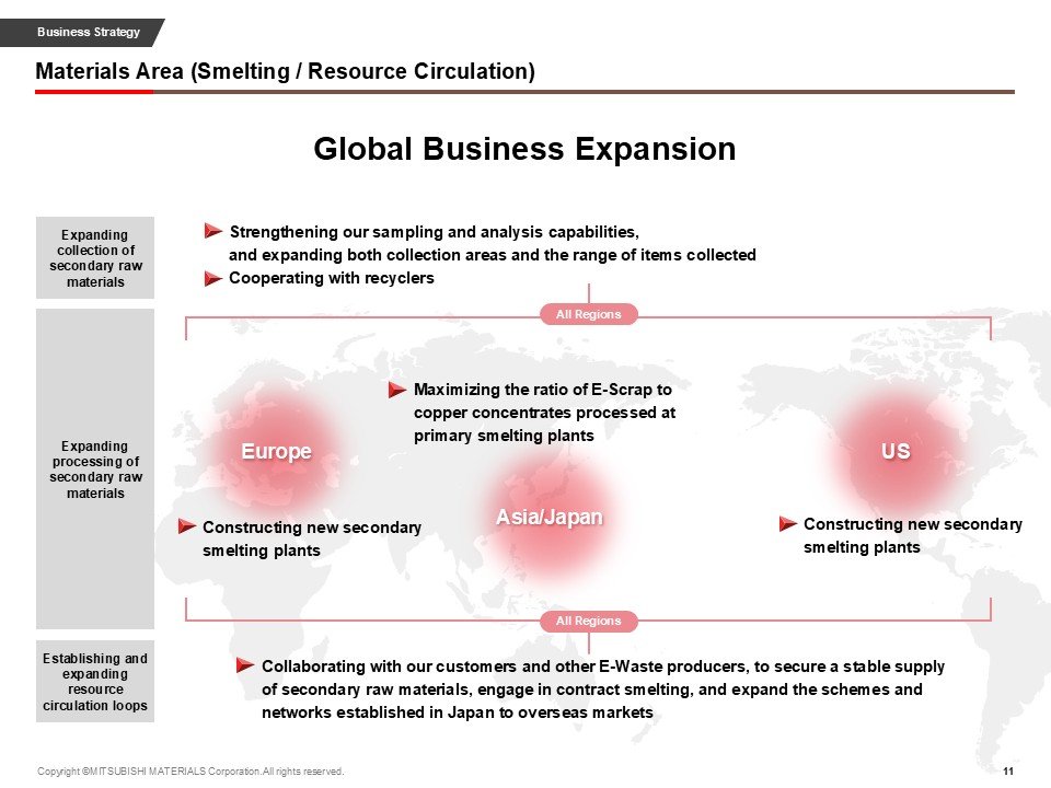 As growth strategies and important measures, we will pursue global expansion of the resource circulation business, expanding secondary smelting and doubling E-Scrap processing, achieving a 100% tungsten recycling rate, and joint purchasing of copper concentrates. These initiatives are designed to maximize corporate value.