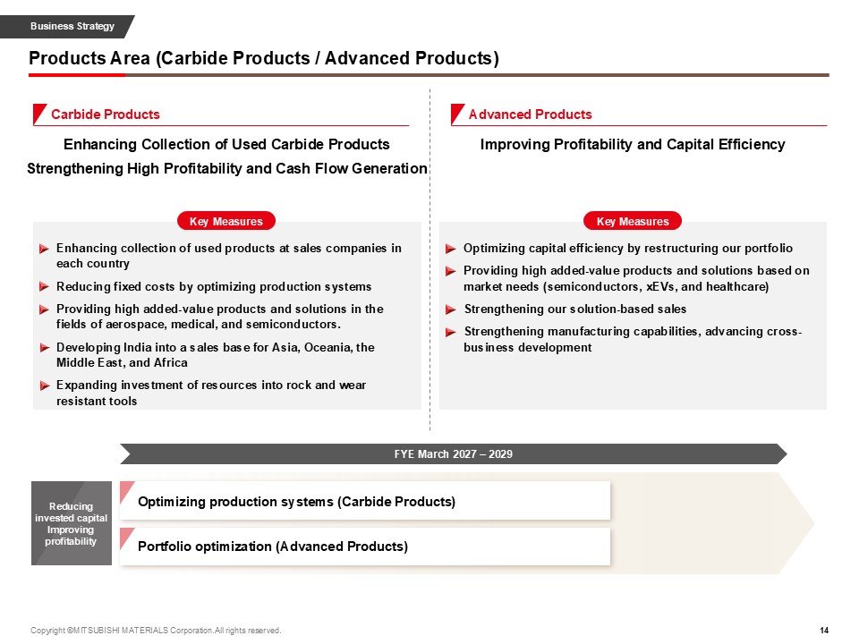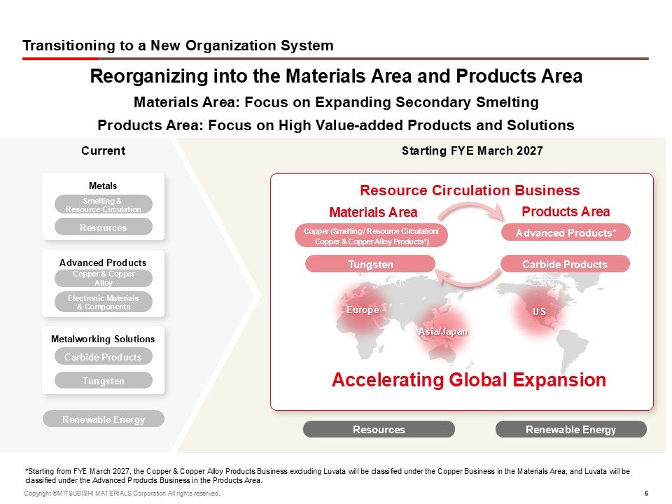Under this reorganization, the process from collecting and processing recycled raw materials to producing copper, copper alloys, and tungsten materials will be positioned as the "Materials Area," while Advanced Products Business and Carbide Products Business further downstream will be positioned as the "Products Area." Both areas will accelerate global expansion. In the Materials Area, we will promote the expansion of secondary smelting, resource circulation loops, and tungsten recycling by integrating related businesses. The mission of the Products Area is to enhance profitability through the provision of high value-added products and solutions.