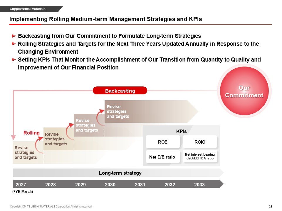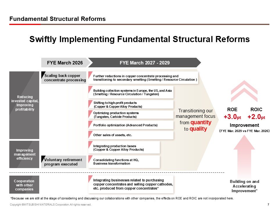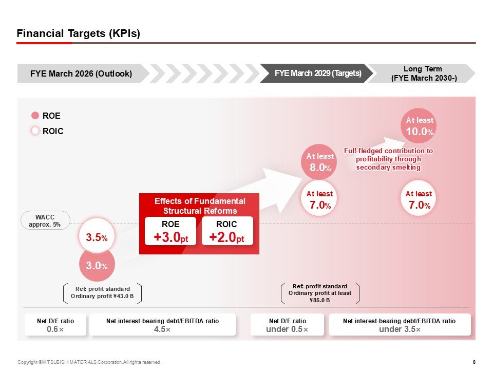 Management focus is shifting from quantity to quality, with swift implementation of measures such as transitioning from copper concentrate processing to secondary smelting, optimizing the production system and business portfolio, and consolidating head office functions. As a result, ROE is expected to improve by three percentage points and ROIC by two percentage points in the fiscal year ending March 2029 compared to the fiscal year ending March 2026.
