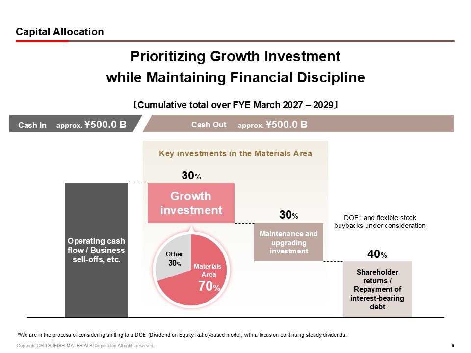 Over the three-year period from the fiscal year ending March 2027 to the fiscal year ending March 2029, we anticipate a total cash inflow of approximately ¥500.0 billion. To ensure financial discipline, a portion of these funds will be used to repay interest-bearing debt. However, our top priority will be to invest in growth, particularly in the Materials Area of our Resource Circulation Business.
