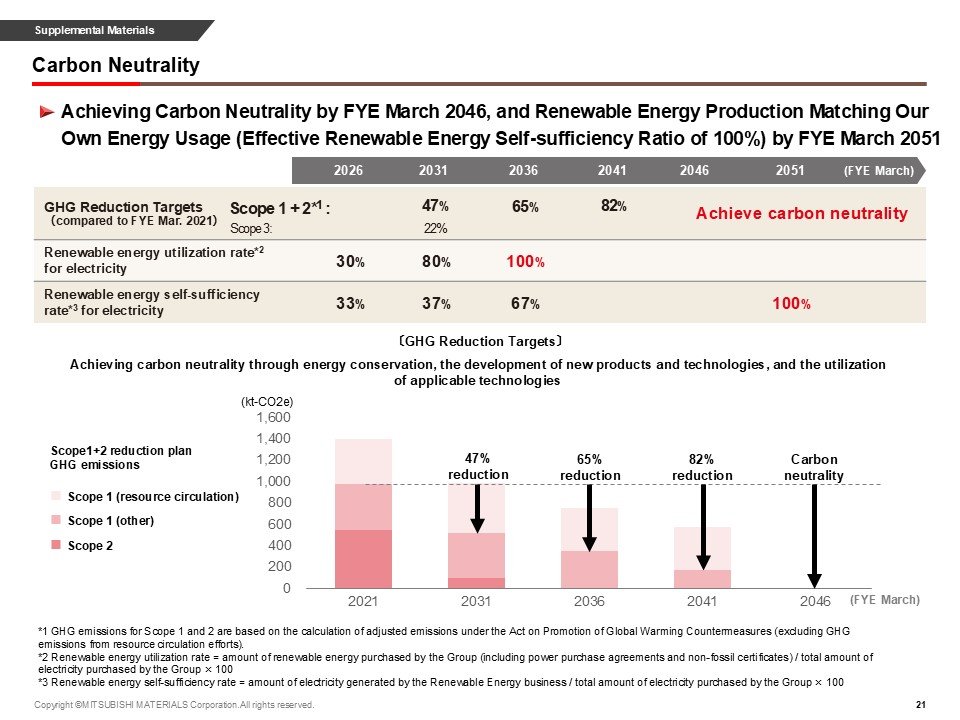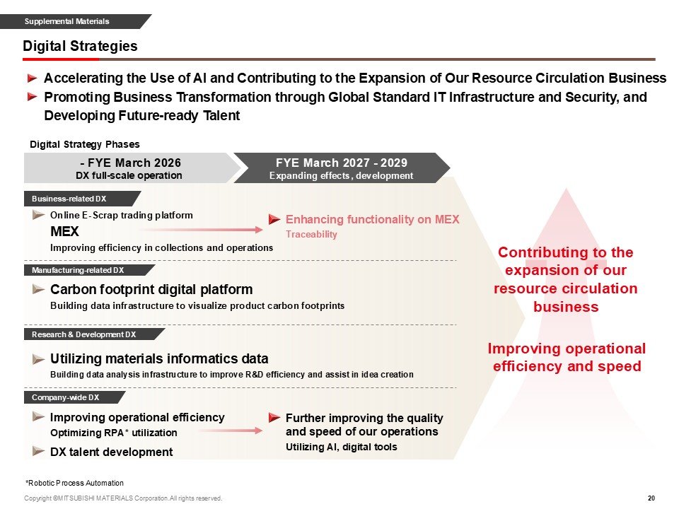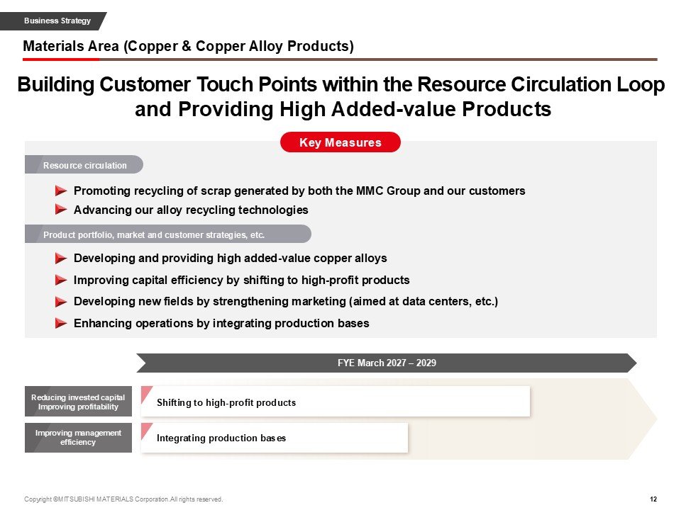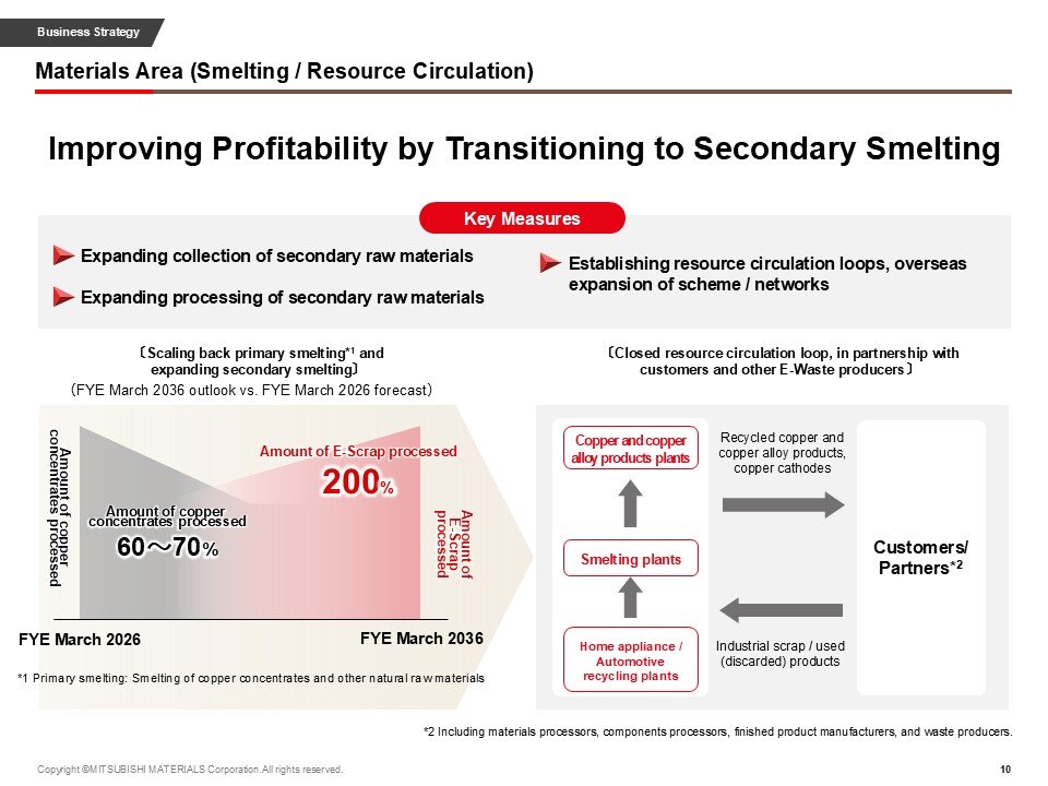 In the Materials Area, for copper-related resource circulation, we seek to achieve improved profitability by advancing the shift toward secondary smelting. Copper concentrate processing volumes are planned to be reduced to 60-70% of the fiscal year ending March 2026 level, while E‑Scrap collection and processing are targeted to double by the fiscal year ending March 2036. Resource circulation loops are being built and expanded to ensure traceability and secure a stable supply of recycled copper cathodes and recycled copper and copper‑alloy products.