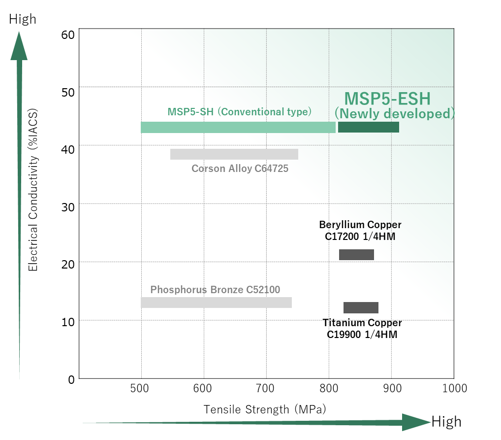 Mitsubishi Materials Corporation (MMC) has developed MSP™5-ESH (Extra Spring Hard), a new high-strength copper alloy, designed for use in automotive electrical components and similar applications. MSP™5-ESH is a solid solution strengthened (*1) copper alloy containing magnesium as the primary alloying element. MSP™5-ESH delivers an excellent balance of manufacturability, performance, and environmental impact compared to conventional high-strength copper alloys.