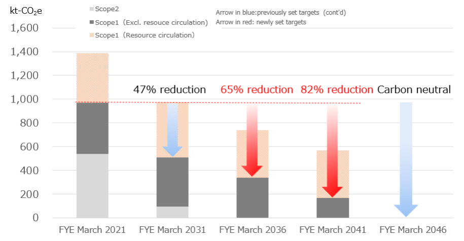As part of further detailing our roadmap toward achieving carbon neutrality by the fiscal year ending March 2046, and taking into account Japan's Nationally Determined Contribution (NDC)*1 set by the Japanese government in February 2025, we have established GHG emission reduction targets for Scope 1(*2) and Scope 2(*3) emissions for fiscal year ending March 2036 and 2041. These new targets are a 65% reduction by fiscal year ending March 2036 and an 82% reduction by fiscal year ending March 2041 (both compared to fiscal year ending March 2021 levels). These figures were calculated based on the slope of a straight line connecting our previously announced fiscal year ending March 2031 and fiscal year ending March 2046 targets.