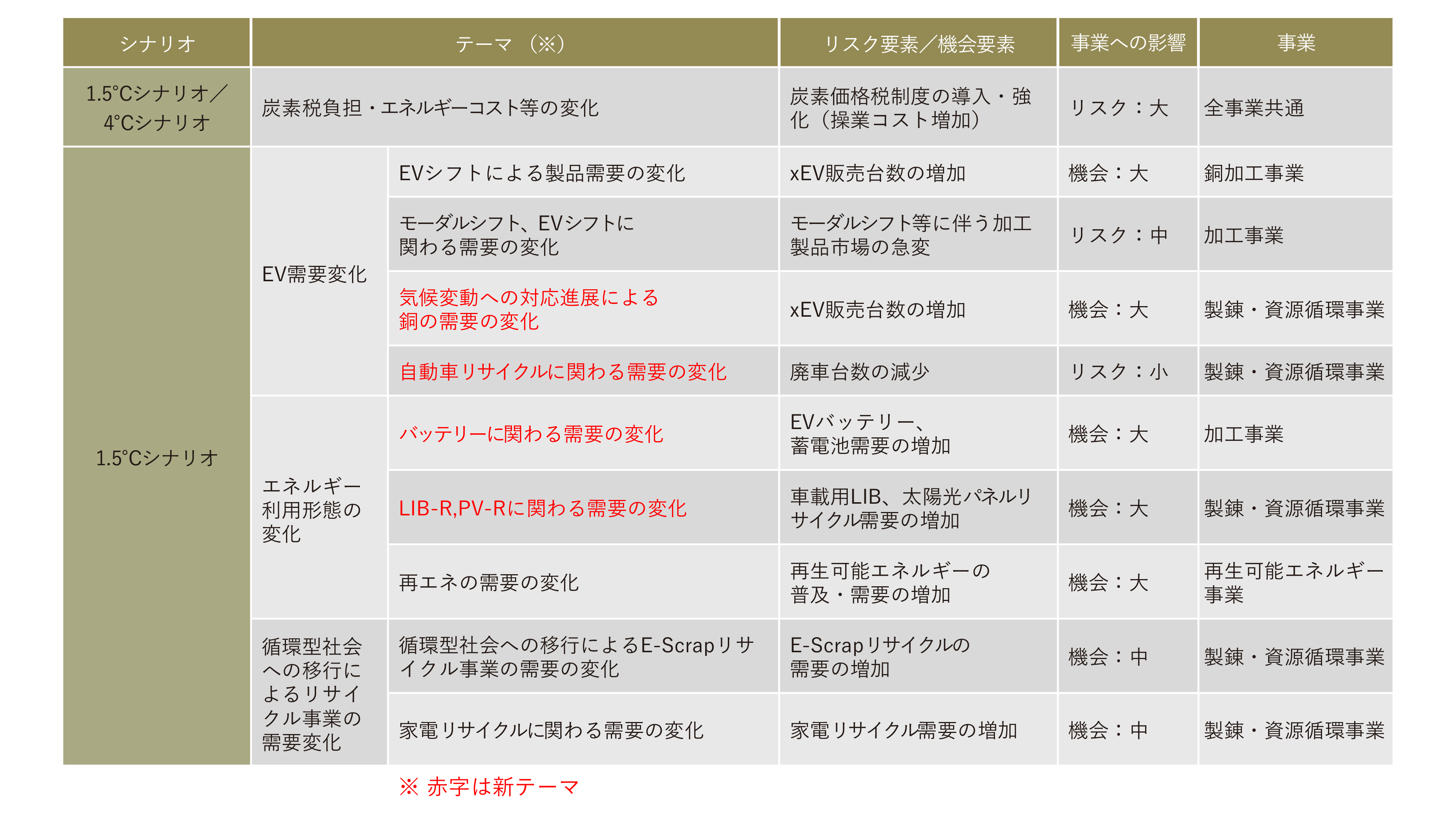 加えて、気候関連財務情報開示タスクフォース(以下、TCFD)の提言に基づくシナリオ分析についても見直しを行い、当社の気候変動に関連するリスクと機会を分析し、当社事業の指標と目標を定めました。