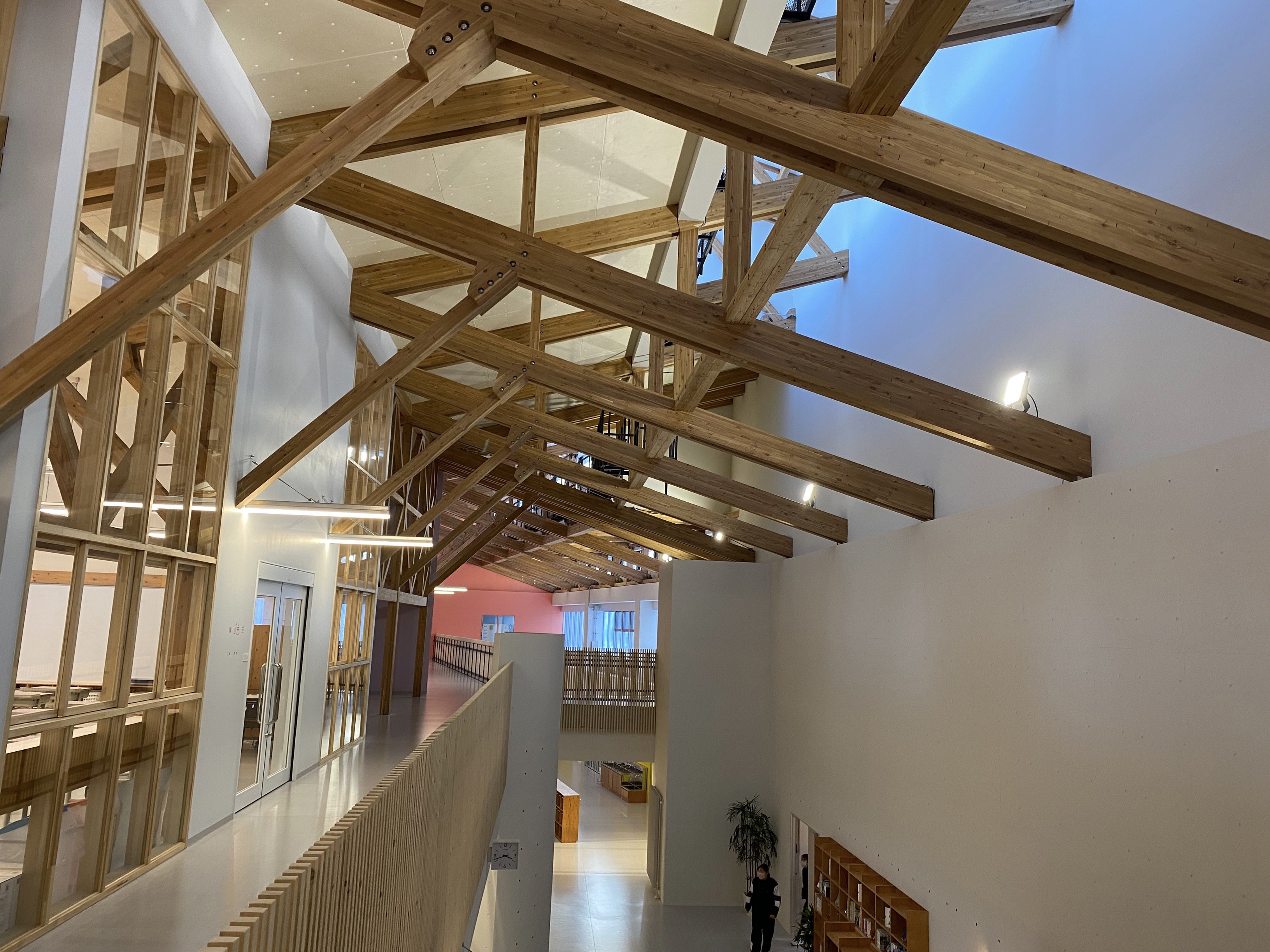 早来学園は町内の3小学校、1中学校が統合し新たに開校する小中一貫の義務教育学校で、図書室や体育館などを地域開放する地元密着型の施設です。開校にあたり新設された校舎は、地元北海道の気候や歴史に育まれた材料や素材をつかうことをコンセプトに建築・設計されました。その中で、同町に所在し当社が所有する早来山林にて、森林整備のために伐採されたカラマツ原木丸太約524m3が新校舎の梁や柱などに使用されています。同校舎で使用されている木材の約半数にあたる量になります。