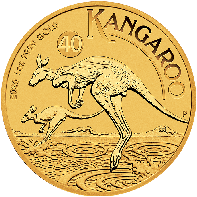 2026年版デザインでは、きらめく水面を跳び越える2頭のカンガルーが主役となり、背景には水面の波紋や水しぶきが描かれ、遠景には山並みが広がっています。また、オーストラリア初の法定金貨シリーズ「オーストラリア・ナゲット」の40周年を記念する「40」の特別なマークやパース造幣局の伝統的なミントマークの「P」が施されています。